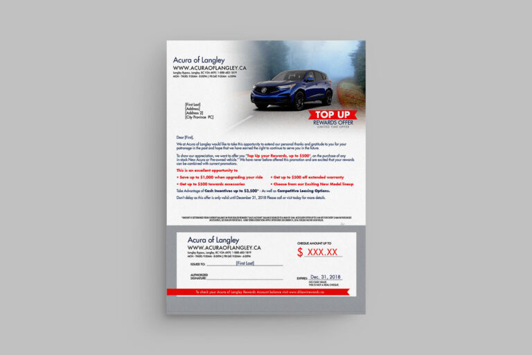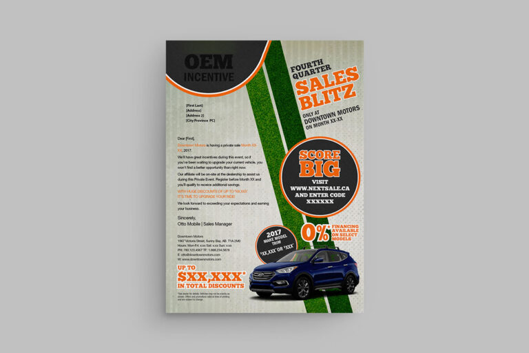 Wow! This letter really stands out. Send out a personal invite to your customers. This dark themed letter is classy & different. You can easily feature a vehicle, plus the models you're looking to sell.