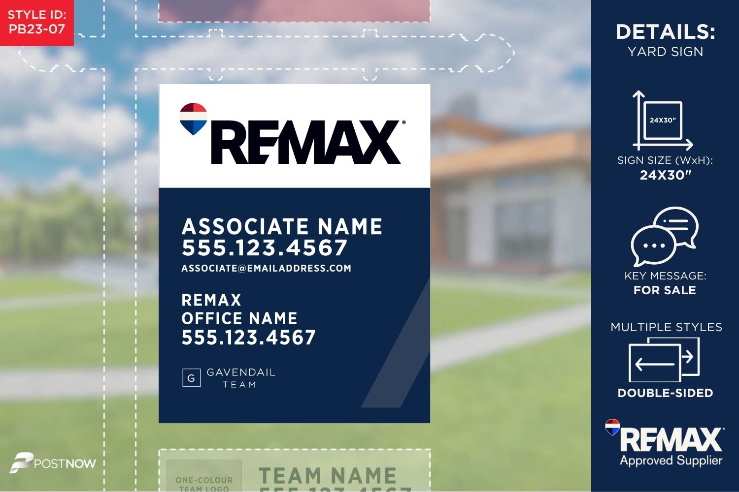 Boost your REMAX listings with this striking 24×30 inch vertical yard sign. Featuring an agent photo (clipped), a distinctive blue slash design, and a designation field, this ‘For Sale’ sign is designed to capture attention and elevate your brand.