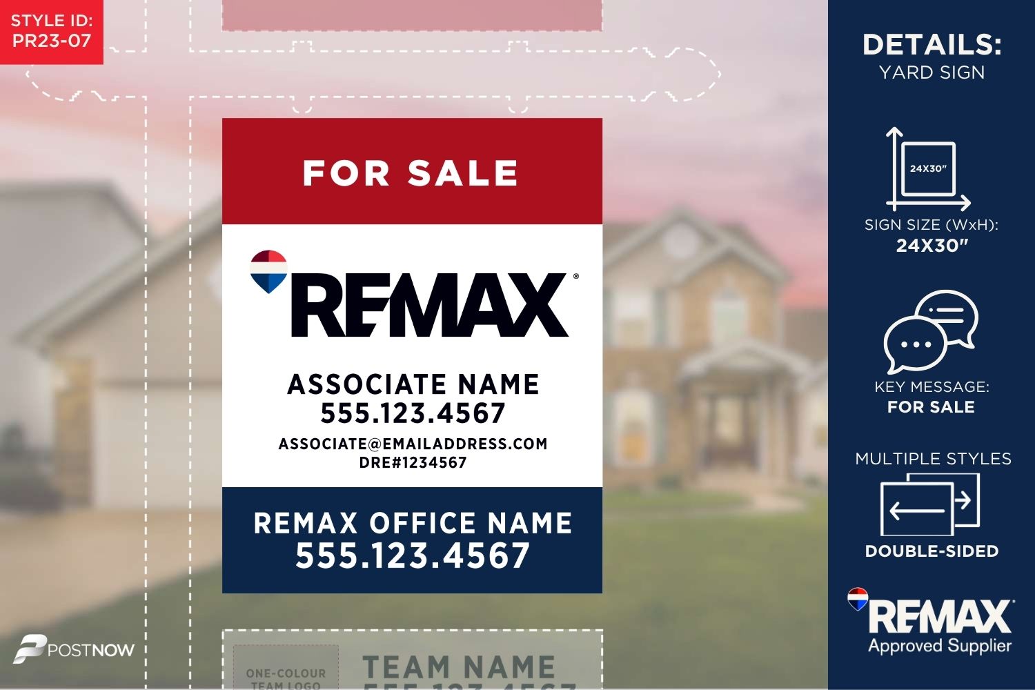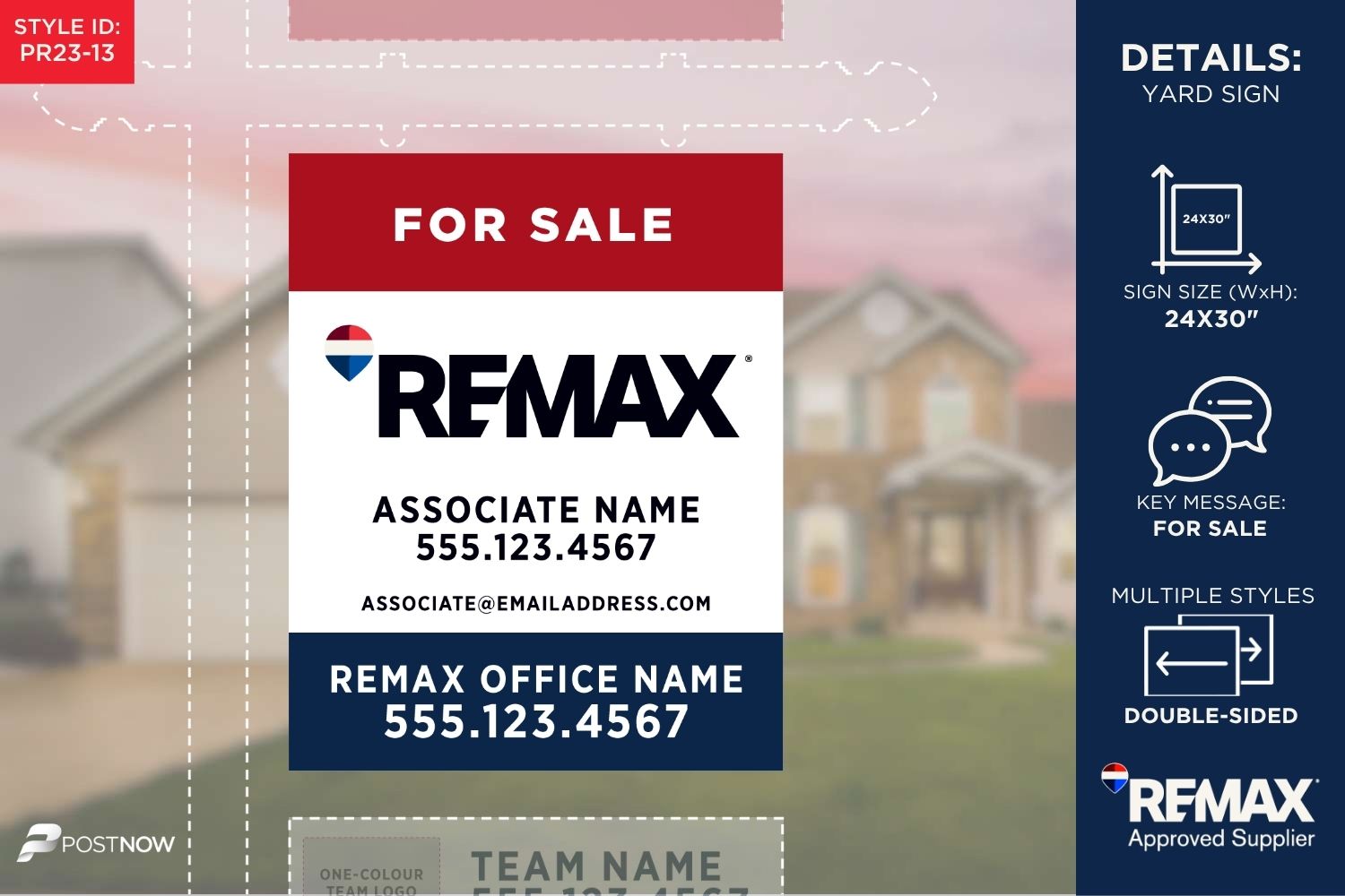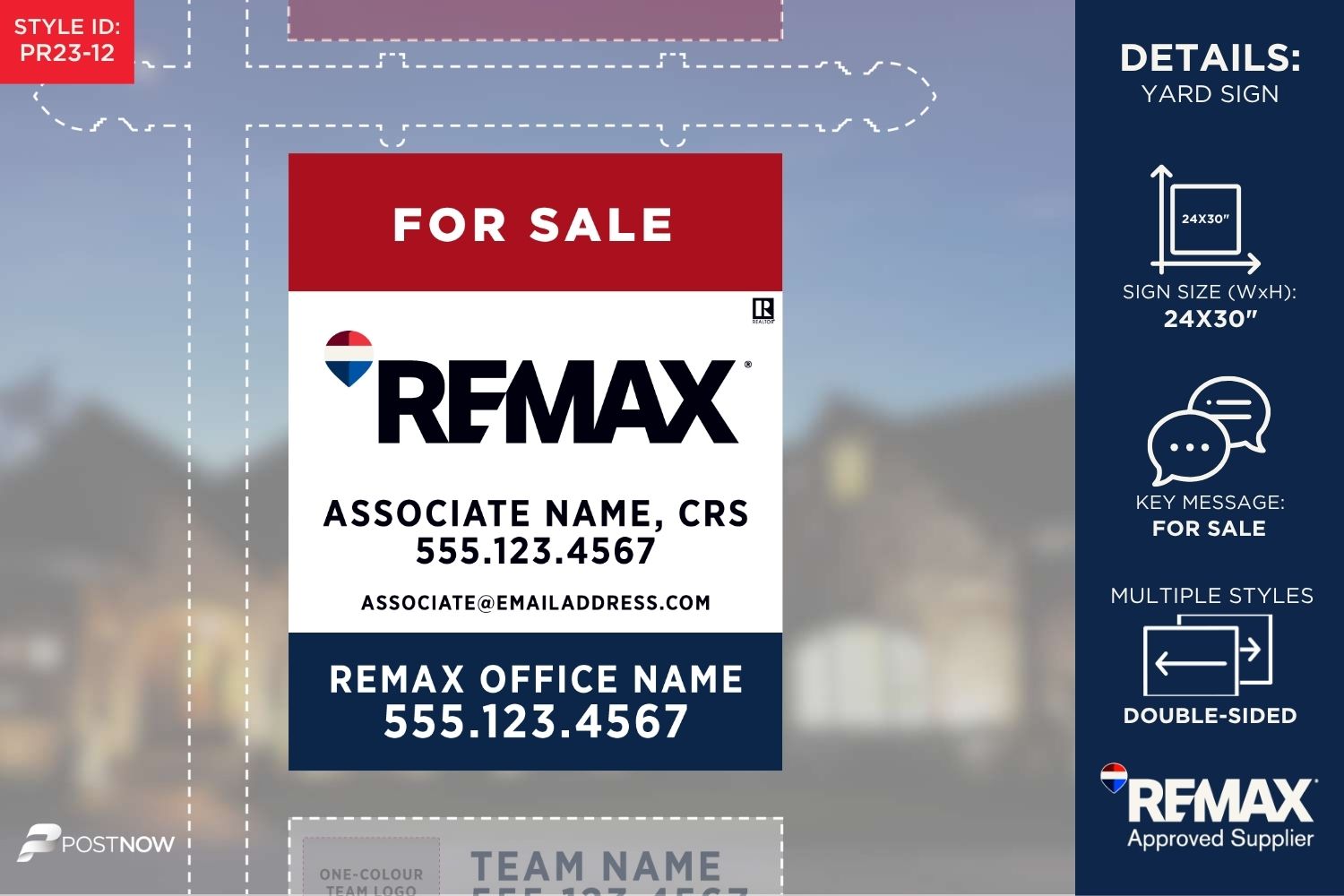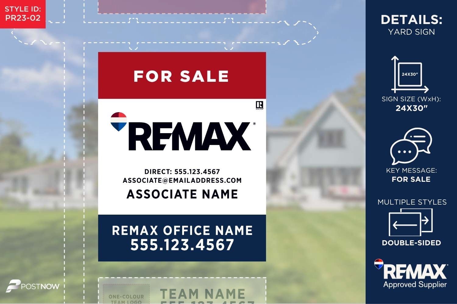 This 24×30 inch vertical REMAX Yard Sign is designed for prominent display, featuring the classic Red, White, and Blue (RWB) REMAX branding. Perfect for real estate agents, these signs highlight key details like office address, associate name, and team logos, ensuring your property stands out.