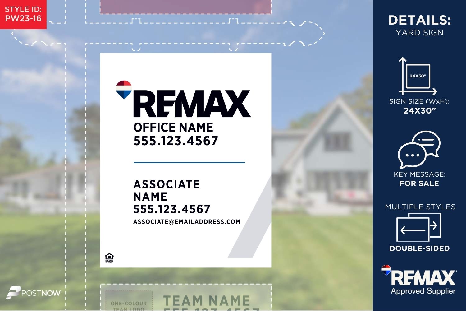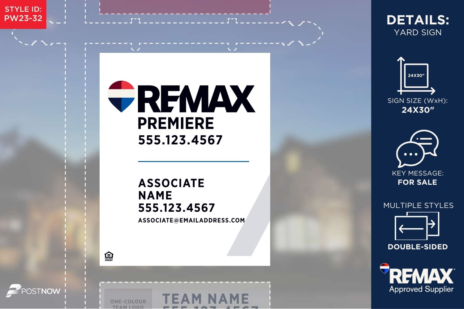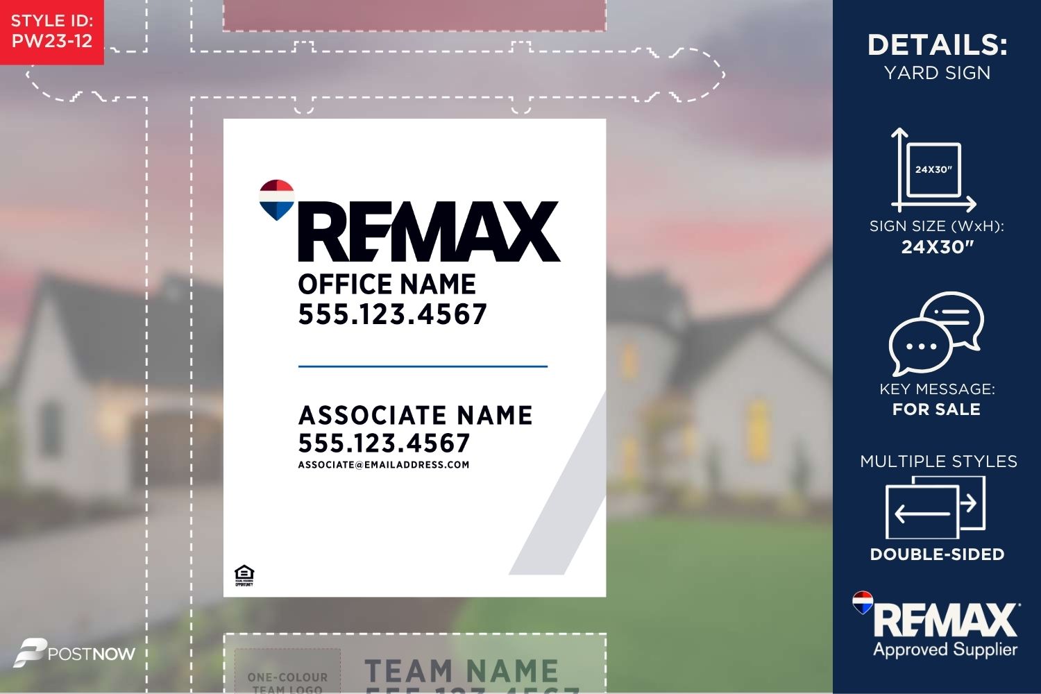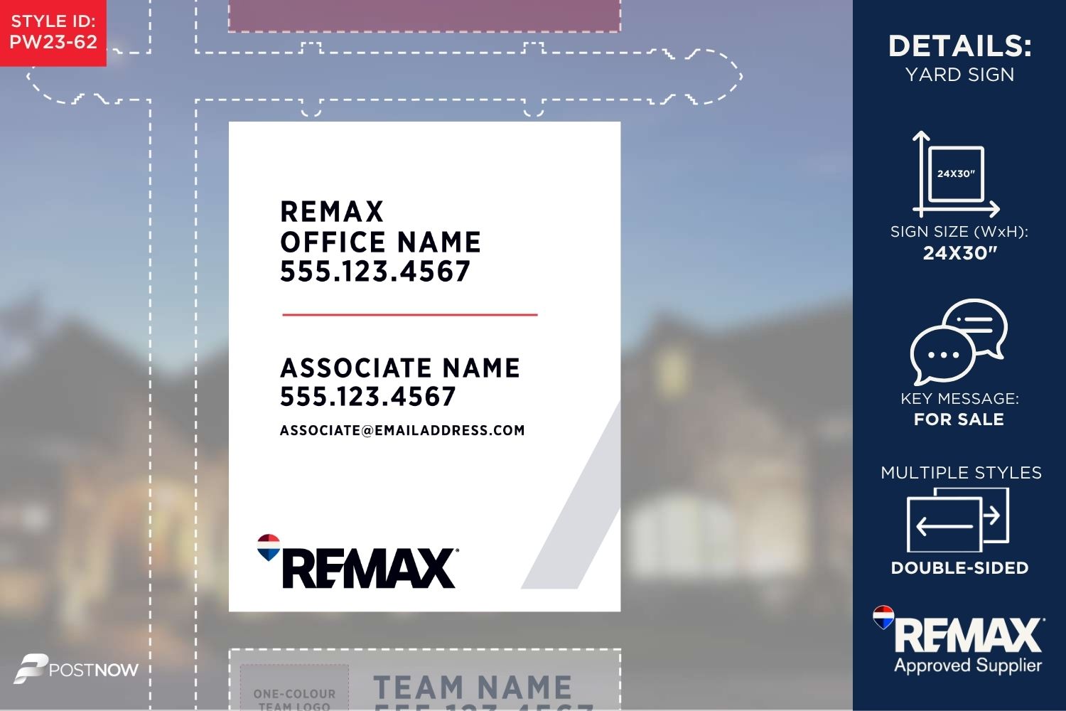 REMAX 24×30 Vertical Yard Sign: Boost visibility for your “For Sale” listings with this classic white slash design, featuring your Associate Team logo.