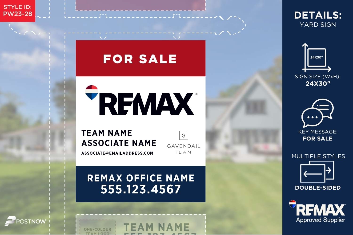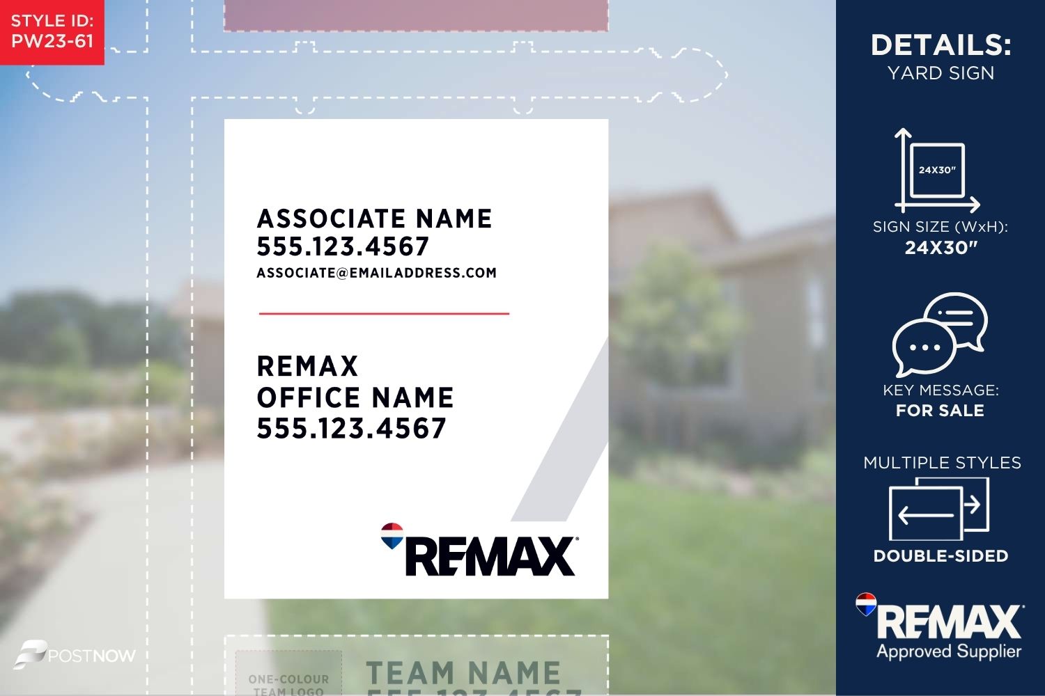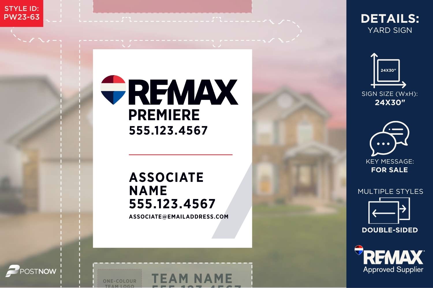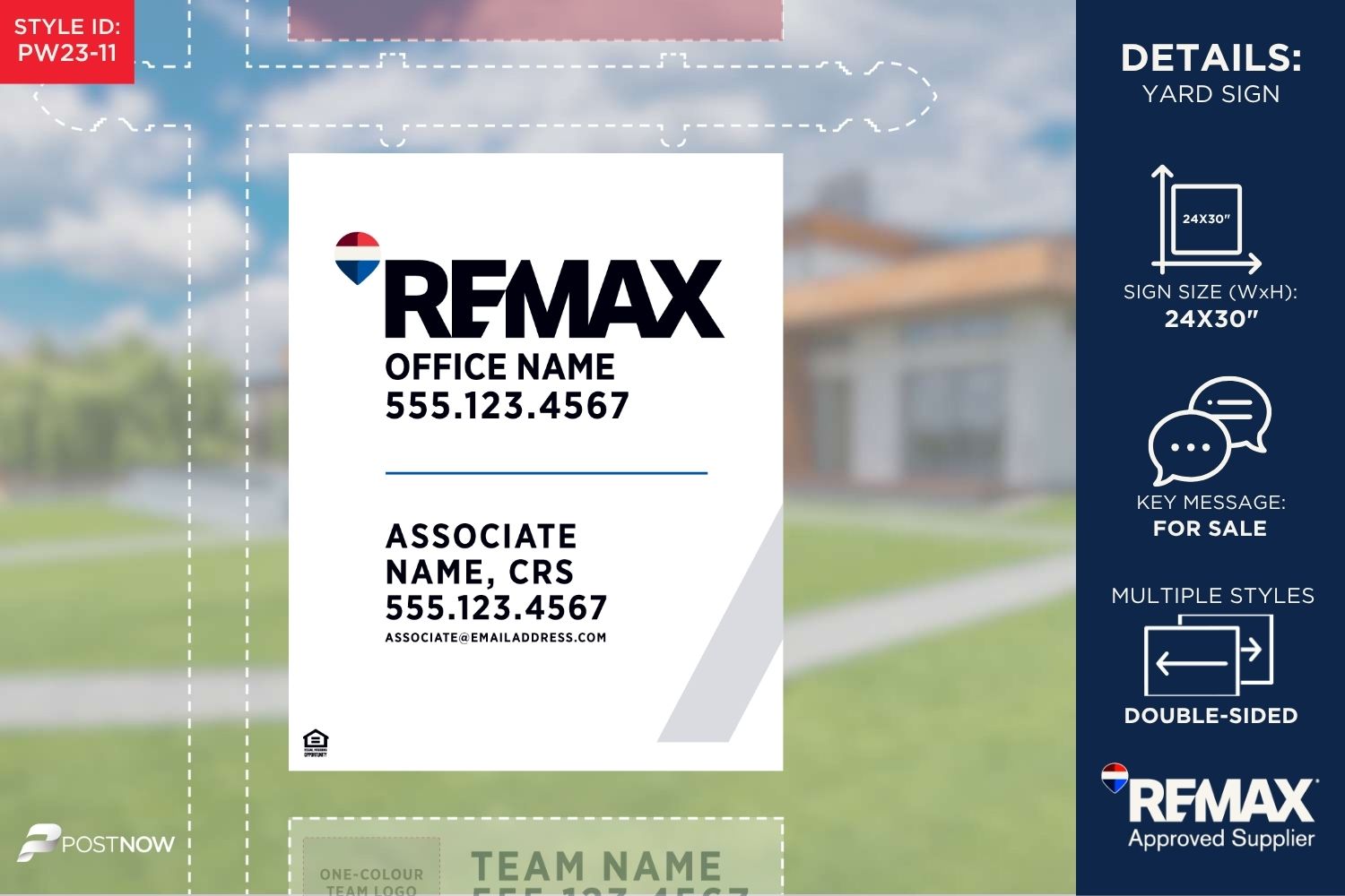 REMAX 24×30 Vertical Yard Sign: Boost visibility for your “For Sale” listings with this classic white slash design, featuring your Associate Team logo.